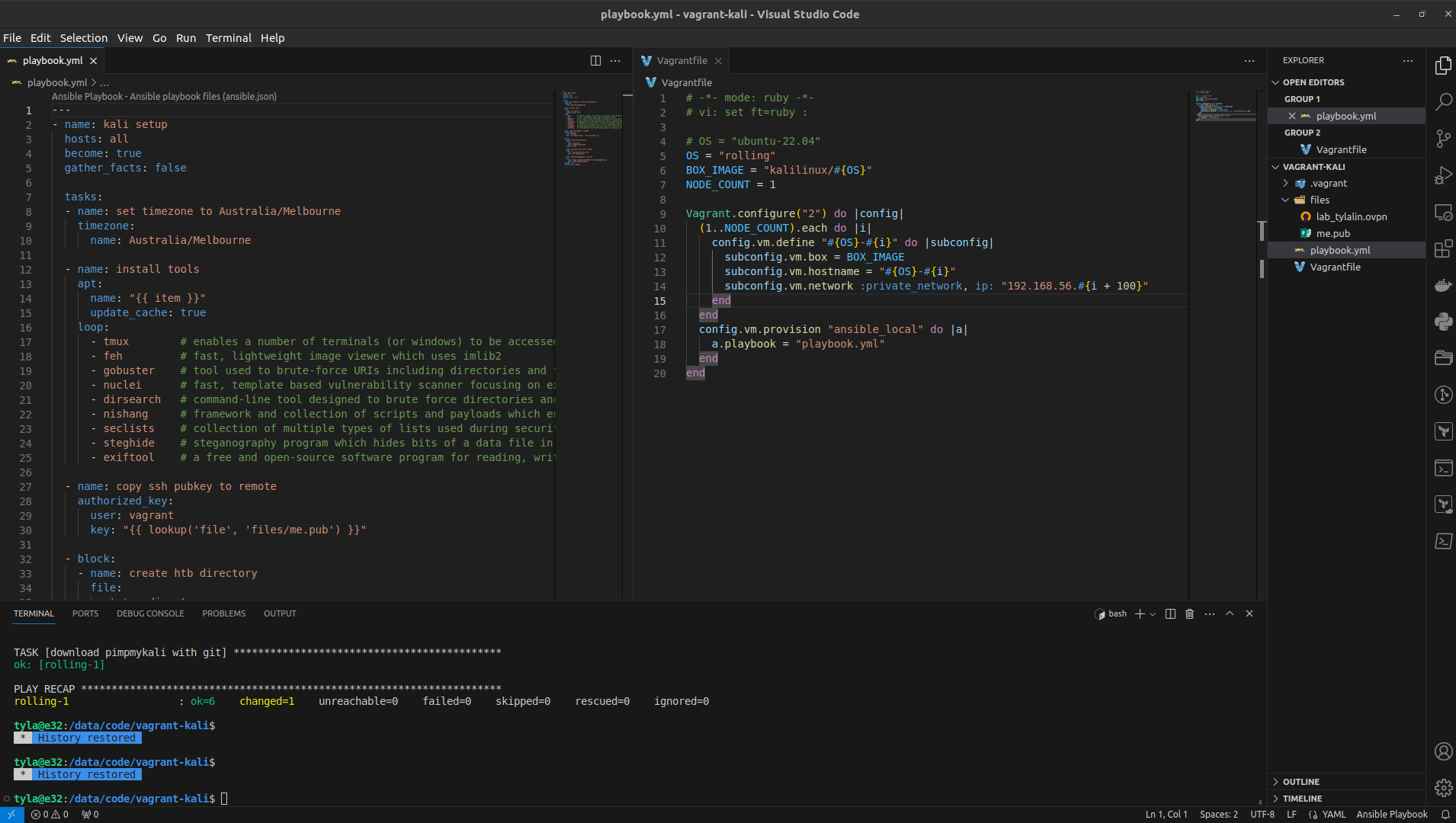 I have uploaded the source code of Vagrantfile and Ansible playbook.yml along with the required sample files on GitHub - https://github.com/tylalin/vagrant-kali
